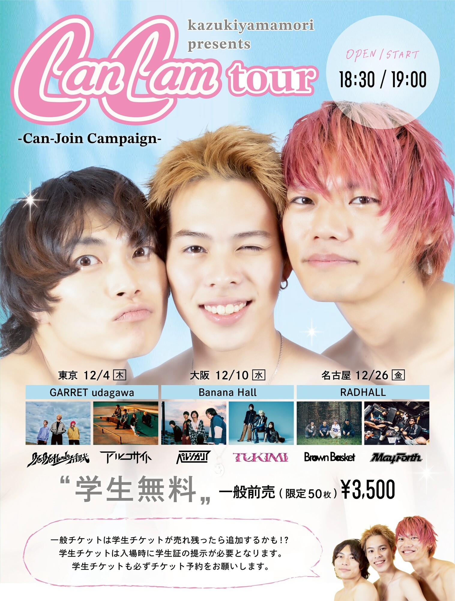 【NEWS!!】SNSで大バズり中の大阪発 3 ピースパンクバンドかずき山盛りが、学生無料の東名阪イベント「CanCam tour -Can-Join Campaign-」のゲストにBye Bye-Handの方程式、アルコサイト、つきみ、ペルシカリア、Brown Basket、May Forthを発表!