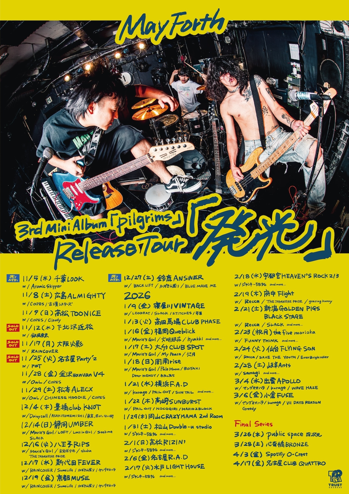 TRUST RECORDSに所属する名古屋発ロックバンド May Forth が、3rd Mini Album “Pilgrims”を掲げて全国を30会場以上を巡るRelease Tour「発光」のファイナルシリーズを東名阪福にて開催する事を発表した。