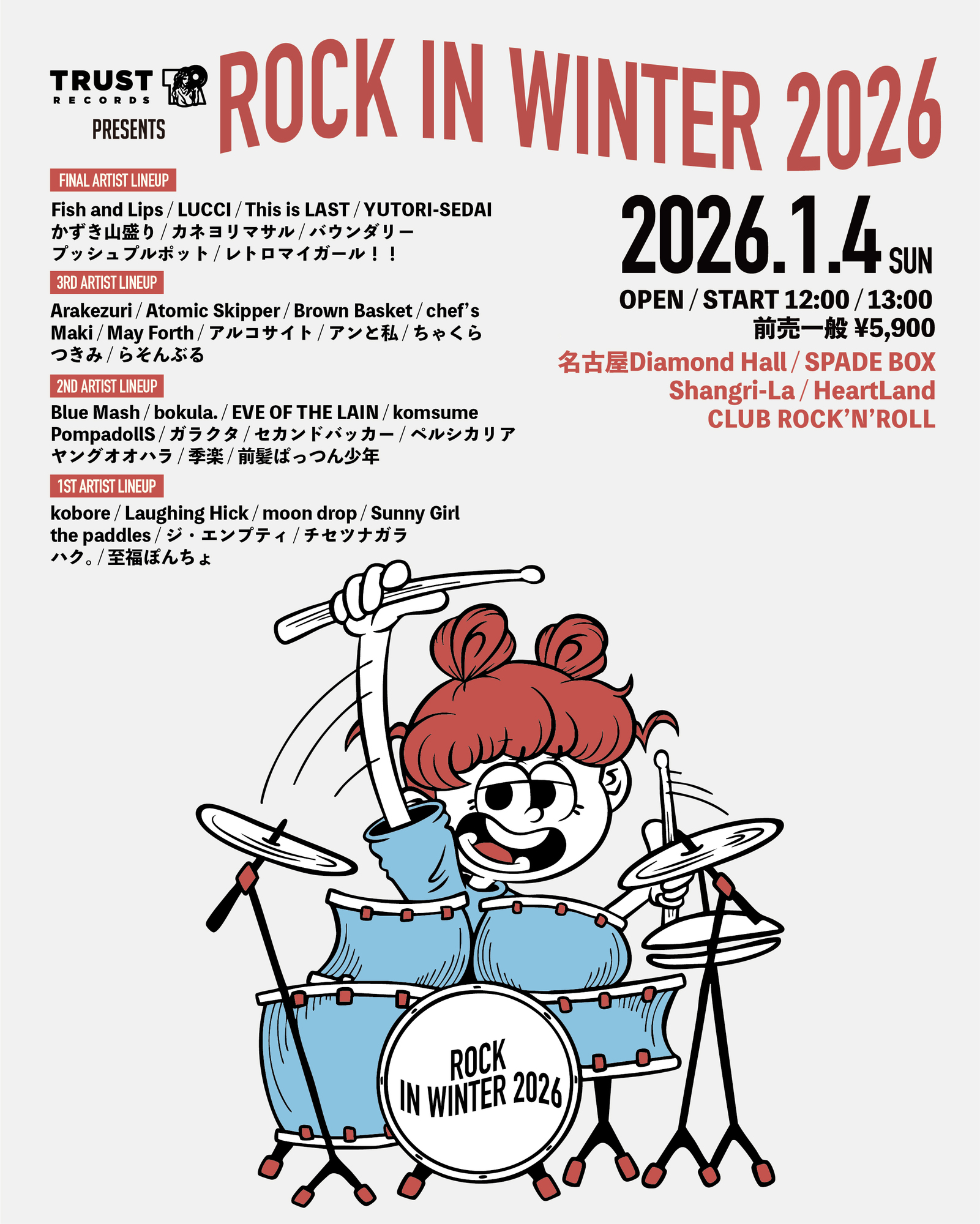 【NEWS!!】名古屋のインディーズレーベルTRUST RECORDSが主催する、冬のサーキットフェス「ROCK IN WINTER 2026」のタイムテーブルが公開!