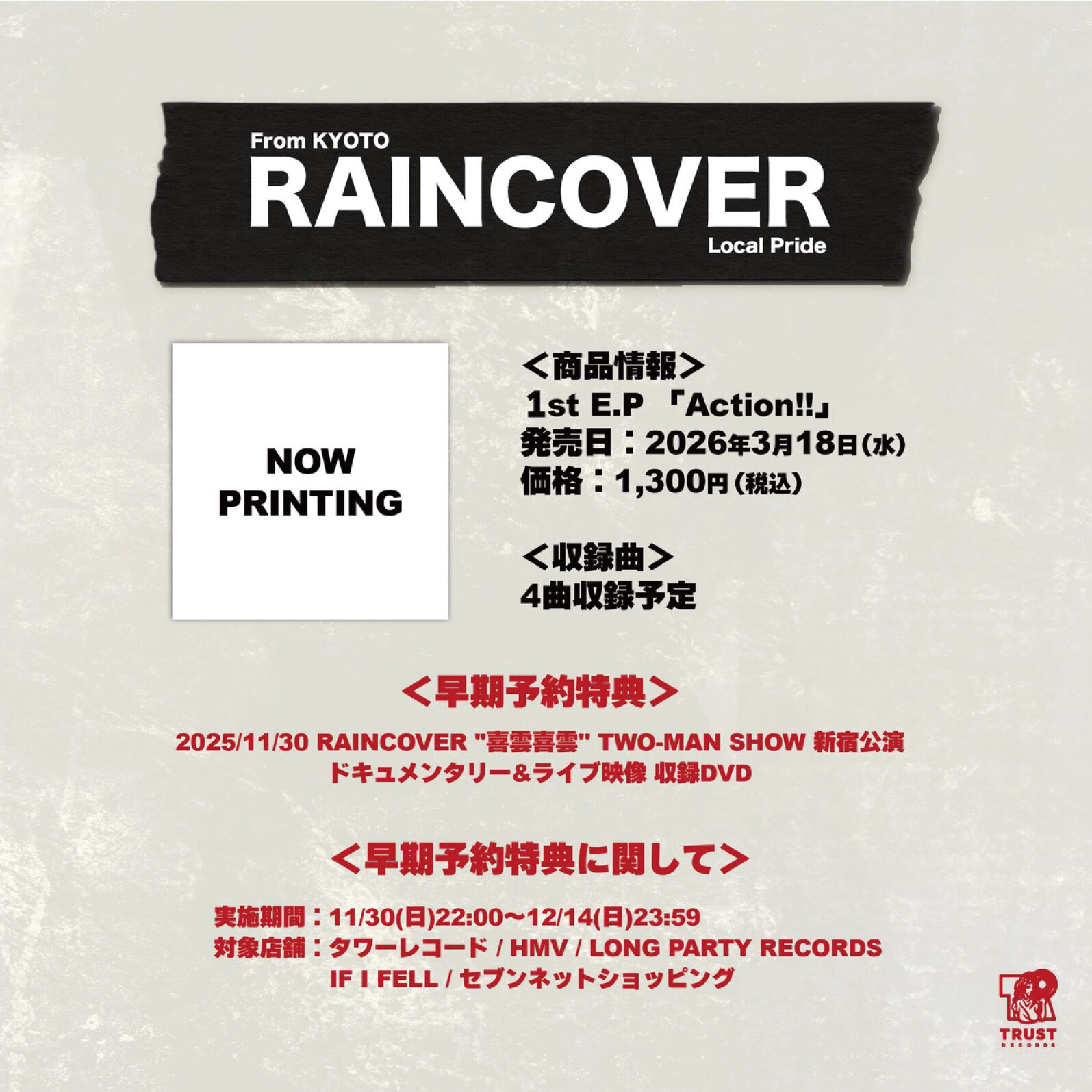 【NEWS!!】京都発TRUST RECORDS所属の4人組ロックバンドRAINCOVERが1st E.P「Action!!」のリリースを発表!リリースに伴い”新祷滅却” -1st E.P「Action!!」Release Tour-開催を発表!