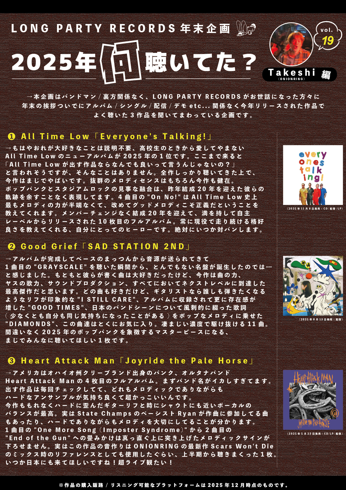 【第19回 Takeshi(ONIONRING/Vo.&Gt.)編】LONG PARTY RECORDS 年末企画"2025年何聴いてた?"