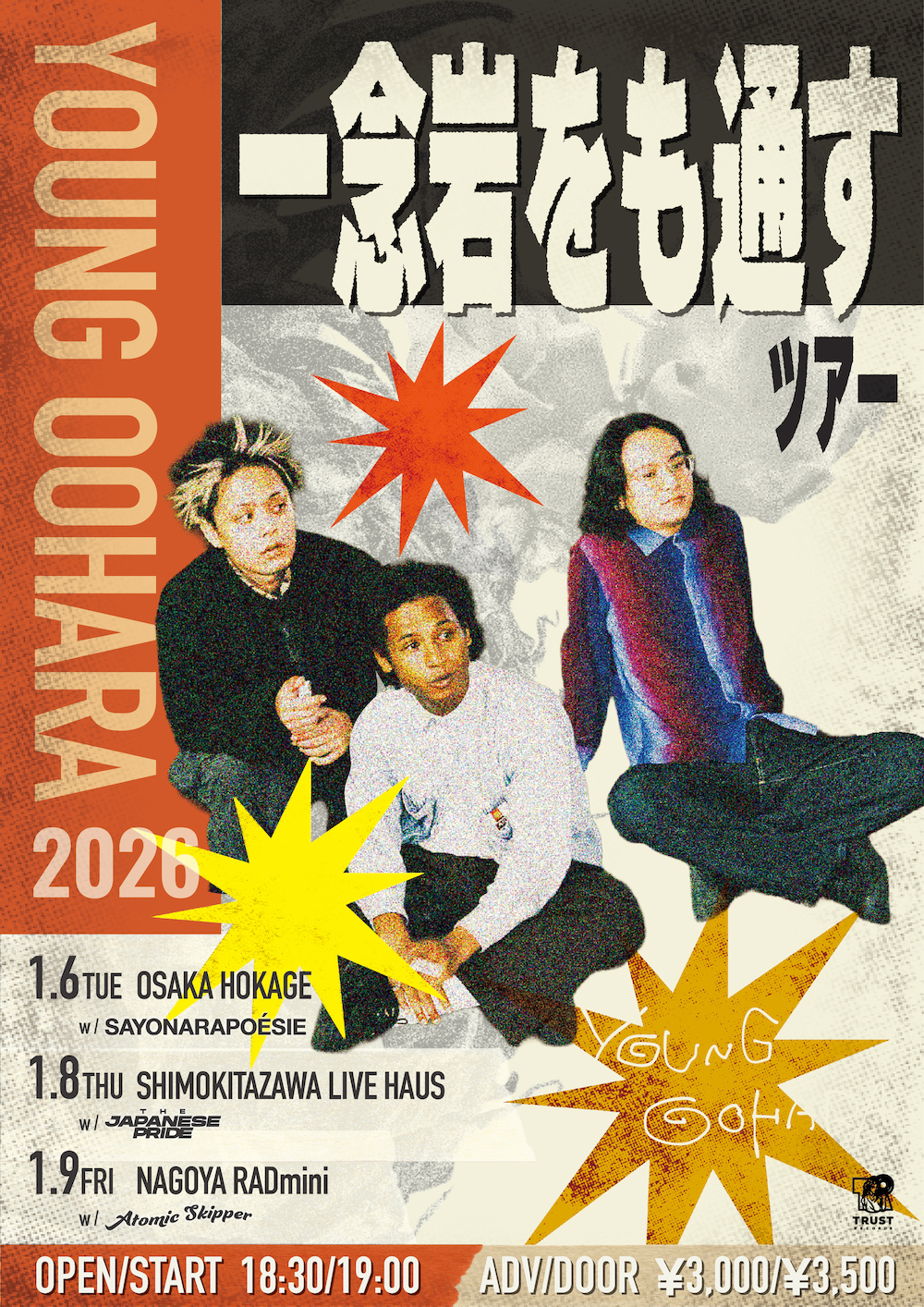 【NEWS!!】名古屋のインディーズレーベルTRUST RECORDS所属、沖縄県在住3人組ロックバンドヤングオオハラが東名阪を回るツアー 「ヤングオオハラ presents. "一念岩をも通すツアー"」のゲストに、さよならポエジー / THE JAPANESE PRIDE / Atomic Skipperを発表!