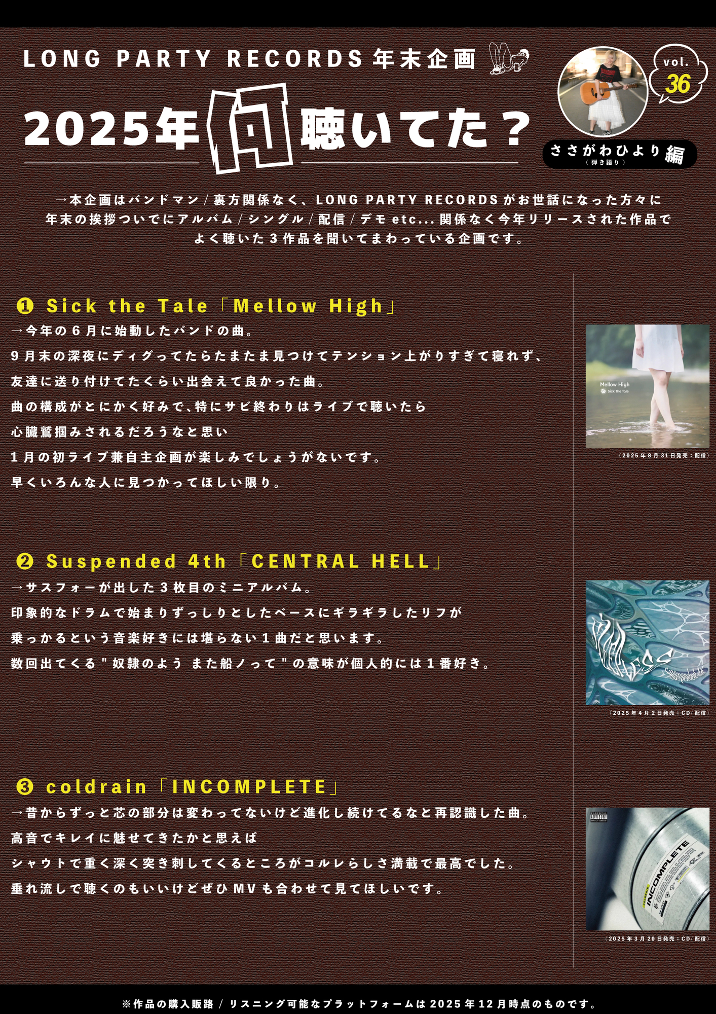 【第36回 ささがわひより(弾き語り)編】LONG PARTY RECORDS 年末企画"2025年何聴いてた?"