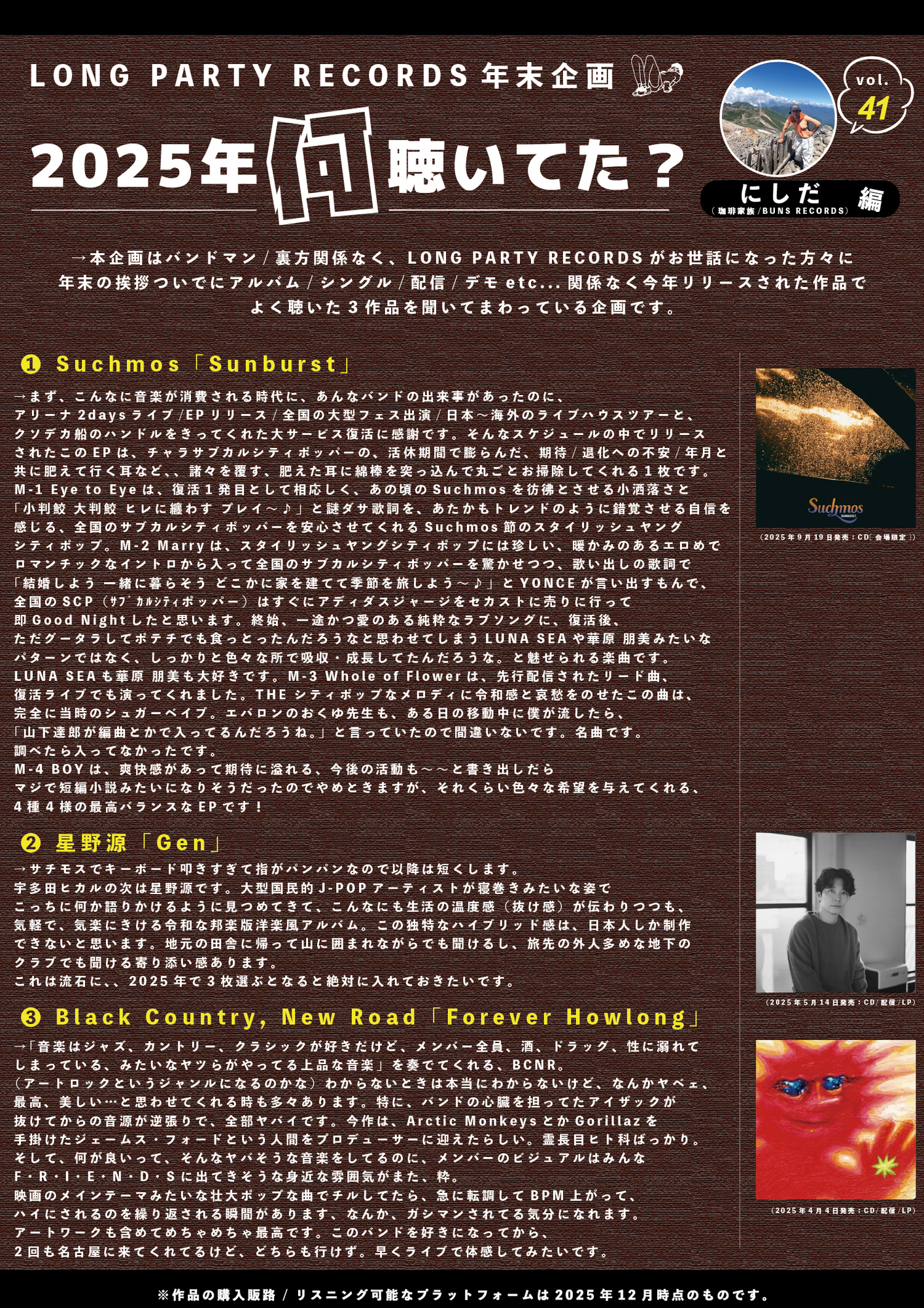 【第41回 にしだ(珈琲家族/BUNS RECORDS)編】LONG PARTY RECORDS 年末企画"2025年何聴いてた?"