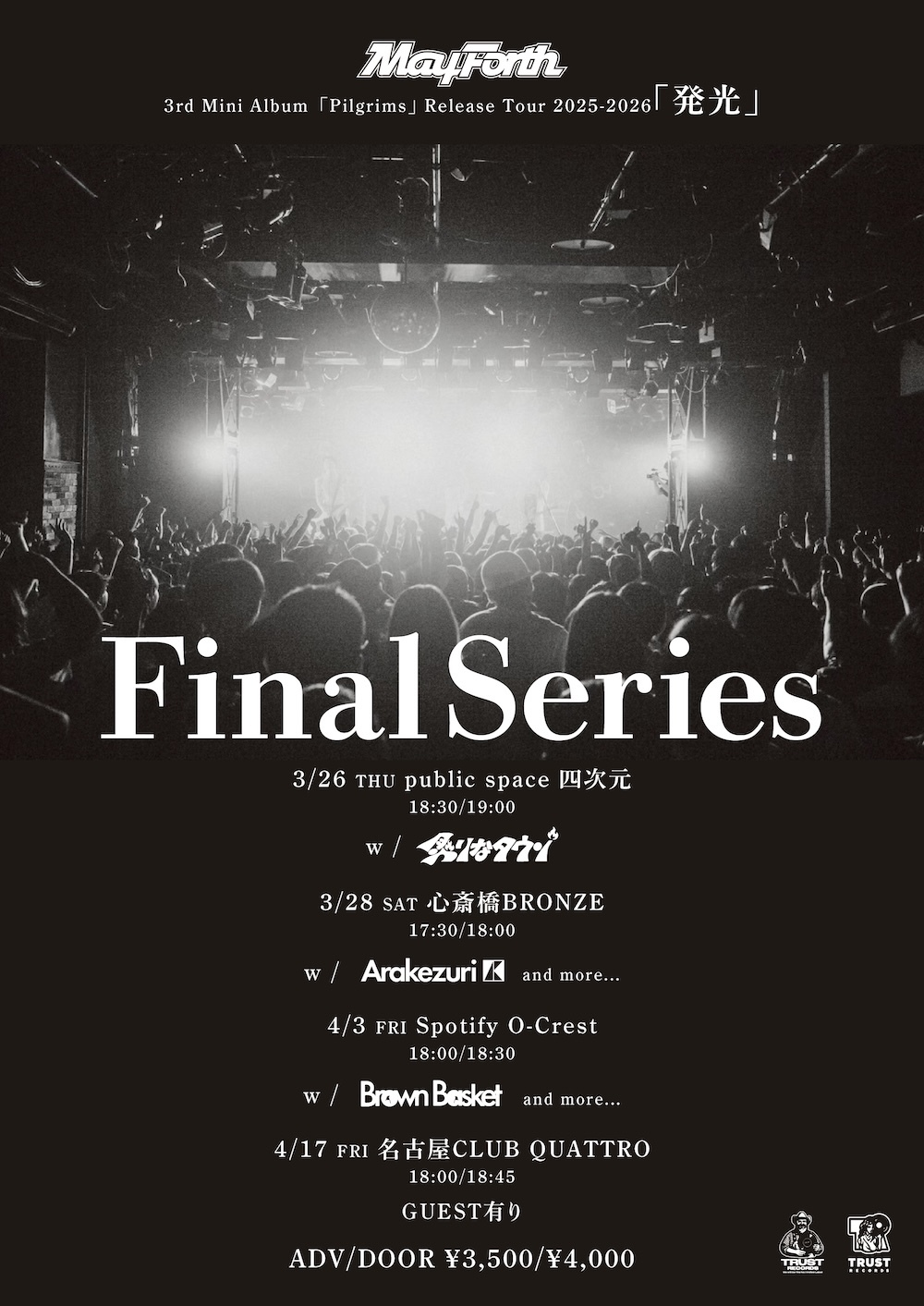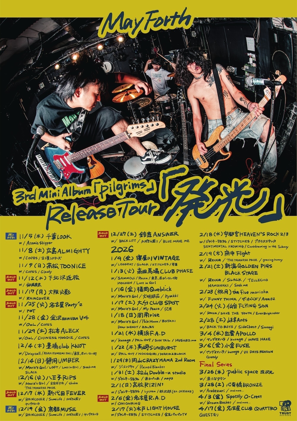 【NEWS!!】TRUST RECORDS所属名古屋発青春パンクバンドMay Forth、30本を越えるリリースツアー を締め括る、ファイナルシリーズ公演のゲスト第1弾アーティストとして、炙りなタウン、Arakezuri、Brown Basketを発表。