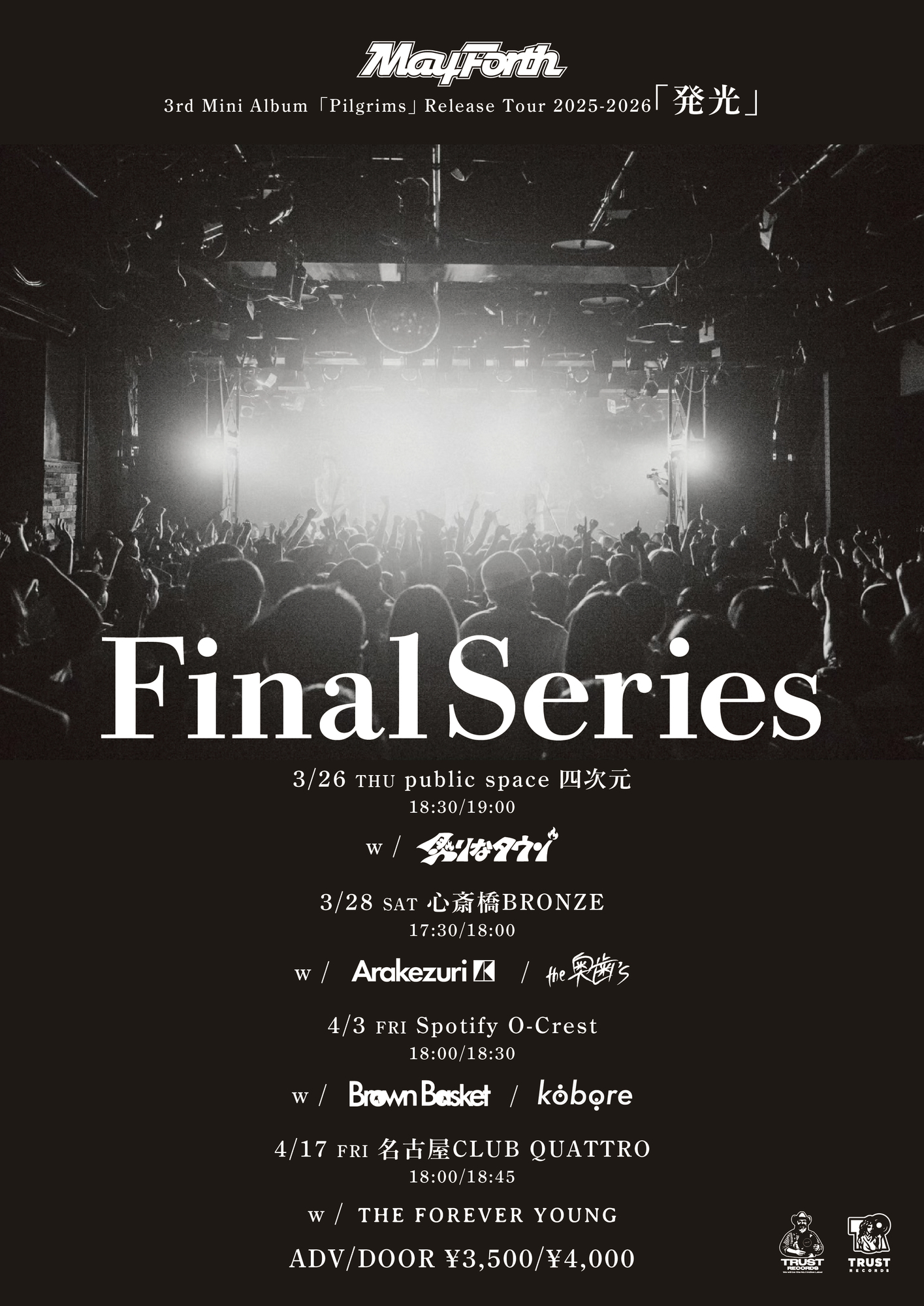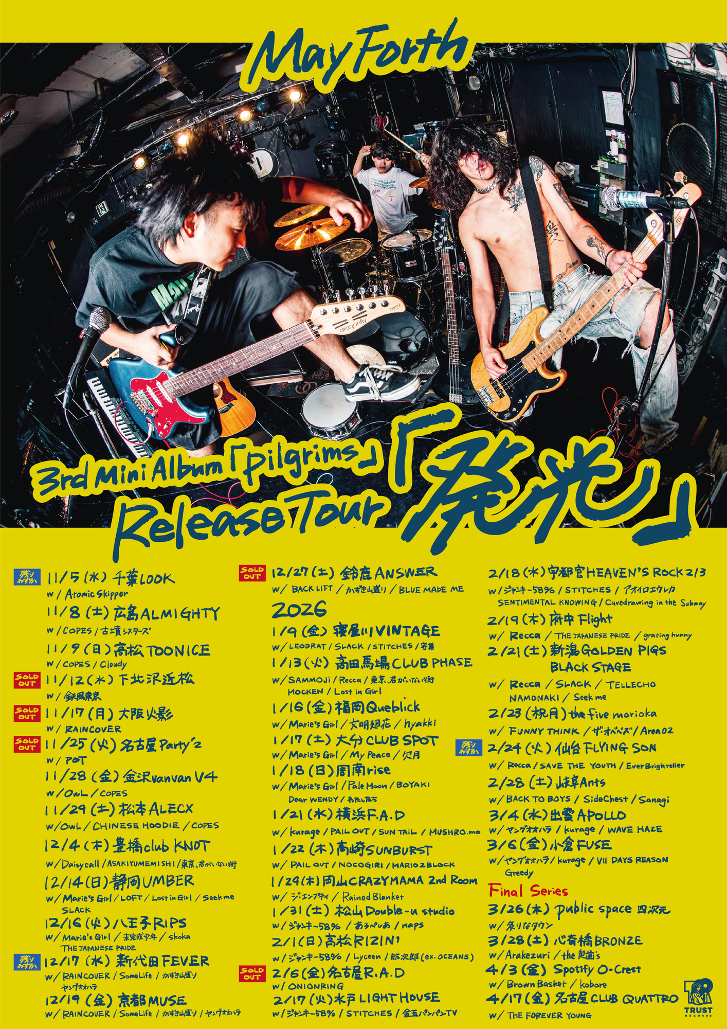 TRUST RECORDSに所属する名古屋発ロックバンド May Forth が、3rd Mini Album「Pilgrims」を掲げ、全国30会場以上を巡るRelease Tour「発光」。