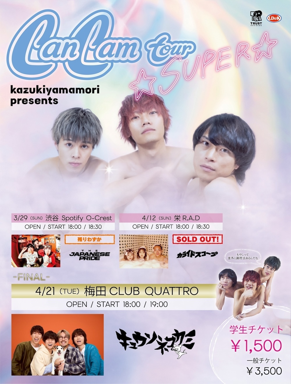 【NEWS!!】大阪発3ピースパンクバンドかずき山盛りが、東名阪企画「CanCam tour ☆SUPER☆」ファイナル公演にキュウソネコカミの出演を発表!更に名古屋公演はソールドアウト!