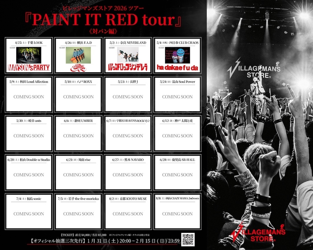 【NEWS!!】ビレッジマンズストア 2026ツアー「PAINT IT RED tour」第一弾ゲスト解禁!