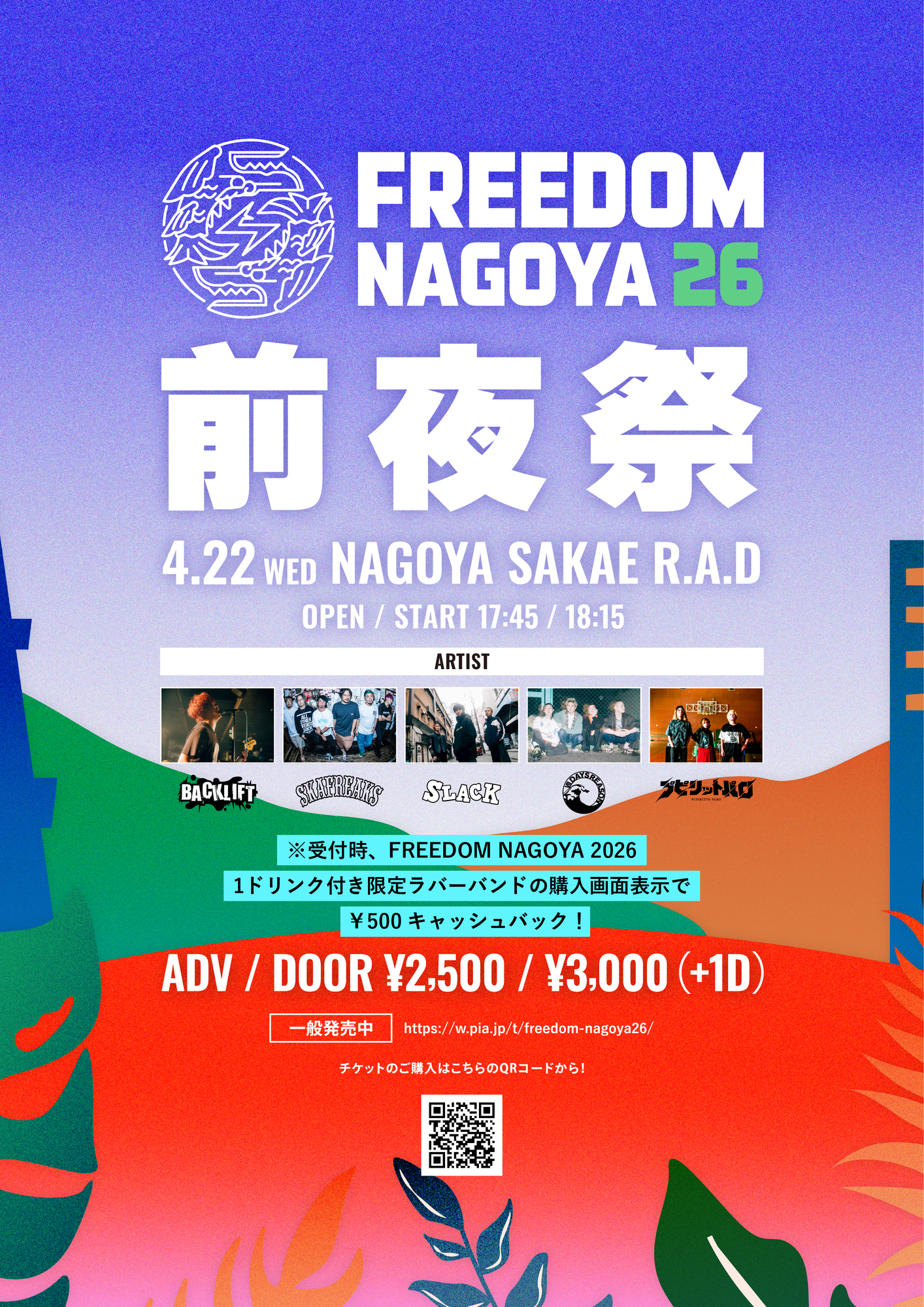 4/22(水)出演アーティストとして、BACK LIFT / SKA FREAKS / SLACK / VII DAYS REASON / プピリットパロ の5組が出演。前夜祭のチケットは只今より一般発売を開始。