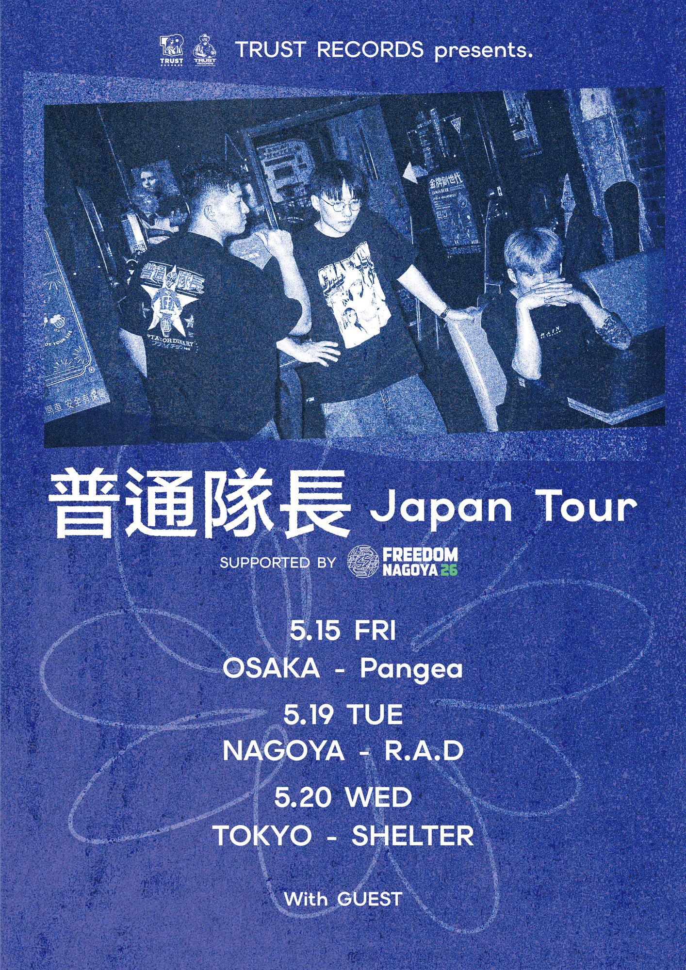 さらに、「FREEDOM NAGOYA2026 前夜祭」を4/22(水)栄R.A.Dにて、「TRUST RECORDS presents. “普通隊長 Japan Tour” supported by FREEDOM NAGOYA」を5/15(金)大阪Pangea、5/19(火) 栄R.A.D、5/20(水) 下北沢SHELTERにて開催することを発表。