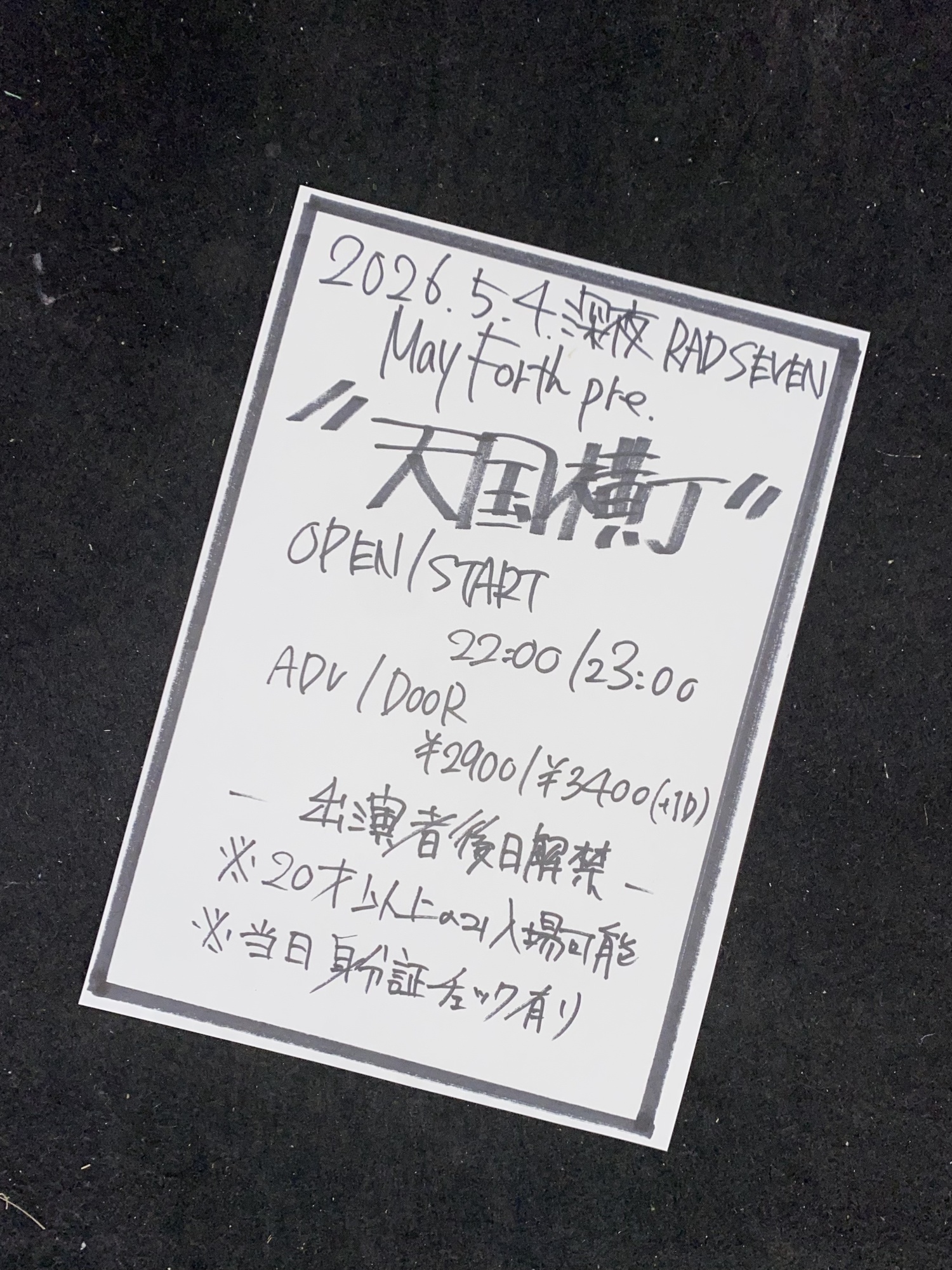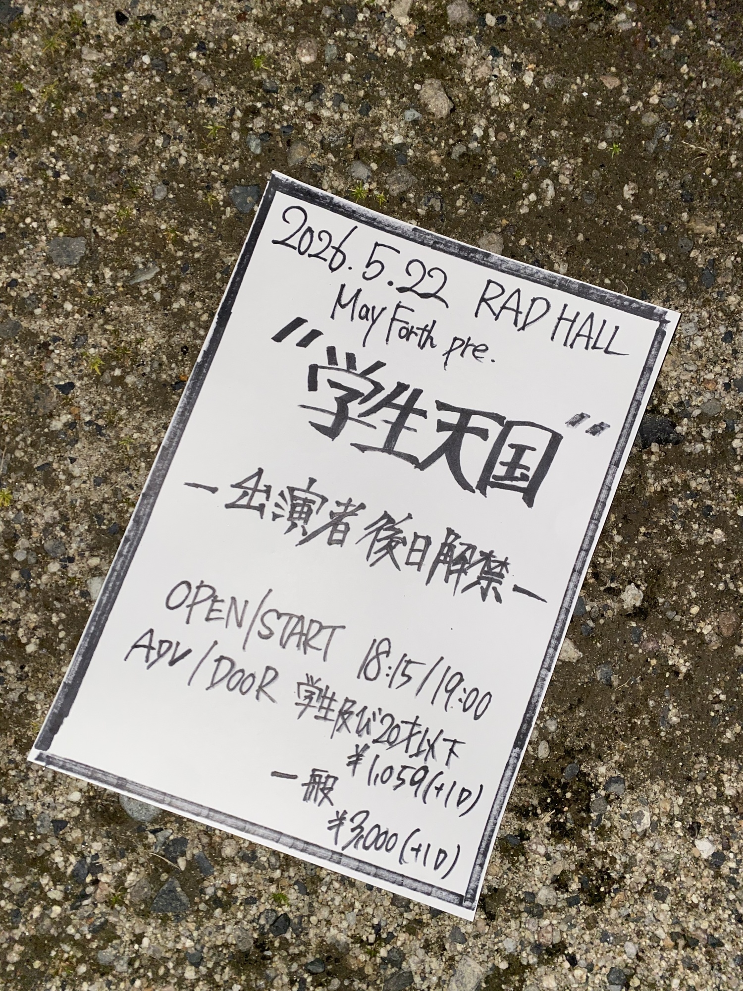 TRUST RECORDSに所属する名古屋発ロマンティックパンクバンドMay Forthが、20才以上限定の深夜イベント「天国横丁」と深夜公演に参加できない10代を優遇するイベント「学生天国」の2公演を開催することを発表した。
