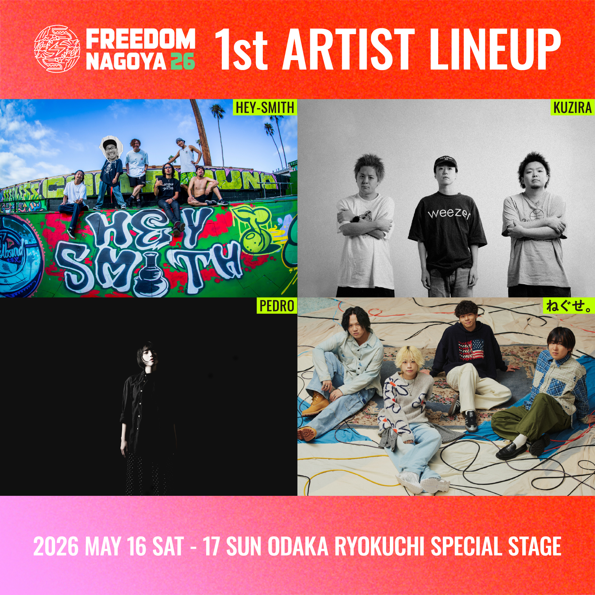 5/16(土)・17(日)に名古屋大高緑地特設ステージにて開催される東海地区最大級無料ロックフェスティバル「FREEDOM NAGOYA 2026」