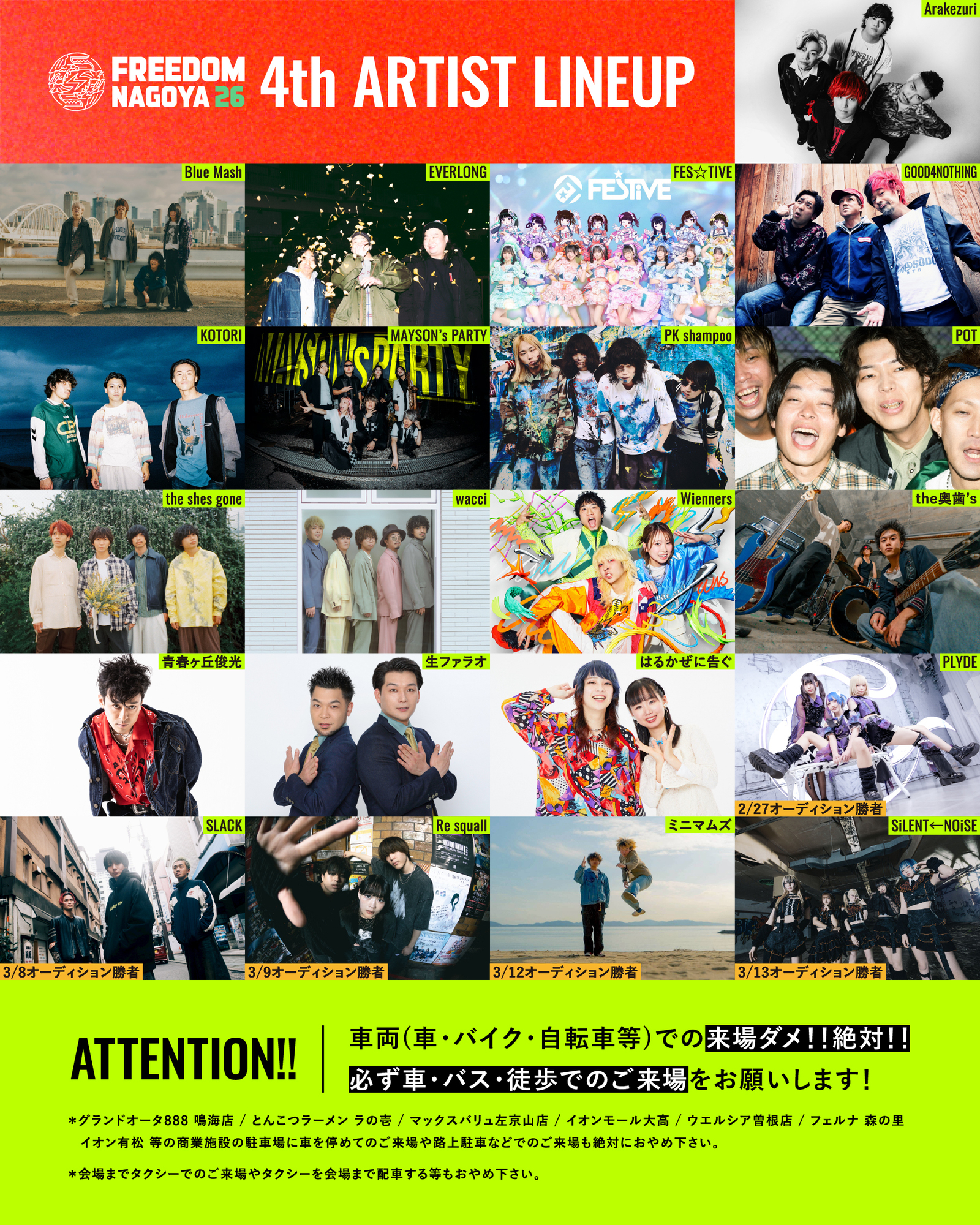 【NEWS!!】東海地区最大級無料ロックフェスティバル「FREEDOM NAGOYA 2026」第4弾出演アーティストとして、FREEDOM NAGOYA初出演のwacci をはじめとする、Arakezuri / Blue Mash / FES☆TIVE / GOOD4NOTHING / KOTORI / Wienners / 青春ヶ丘俊光 / 生ファラオ / はるかぜに告ぐ を含む、合計36組の出演を発表! 併せてFREEDOM NAGOYA後夜祭の開催も発表!