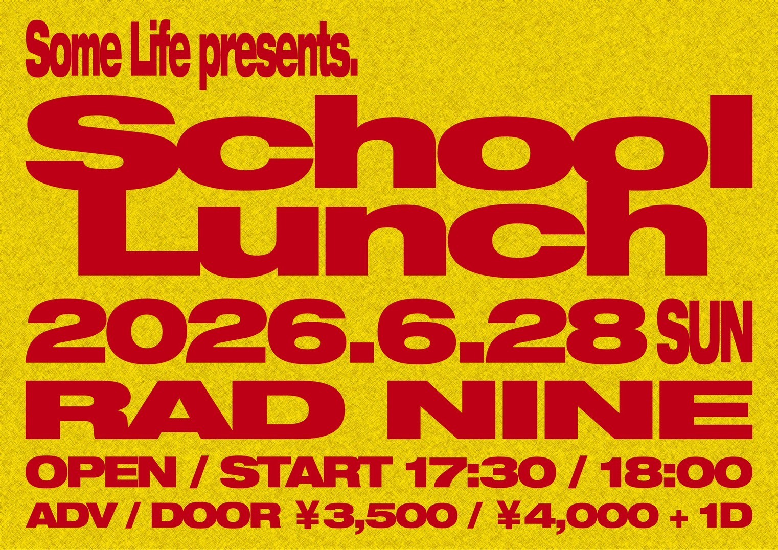 3月21日(土)に、3回目となる自主企画の”Twilight School”を開催し大盛況だったSome Life が、オールナイトイベントの”Twilight School”とは、また別のアプローチで企画する”School Lunch”を6月28日(日)にRAD NINEで開催する。