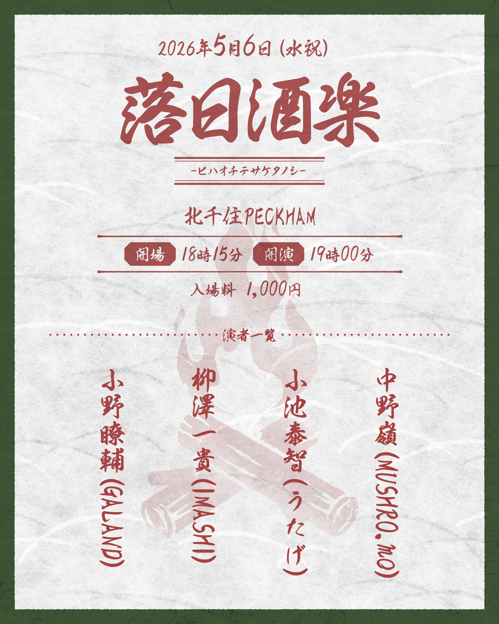 2026年5月6日(水)北千住 PECKHAM「柳澤一貴、小池泰智 pre. "落日酒楽"」