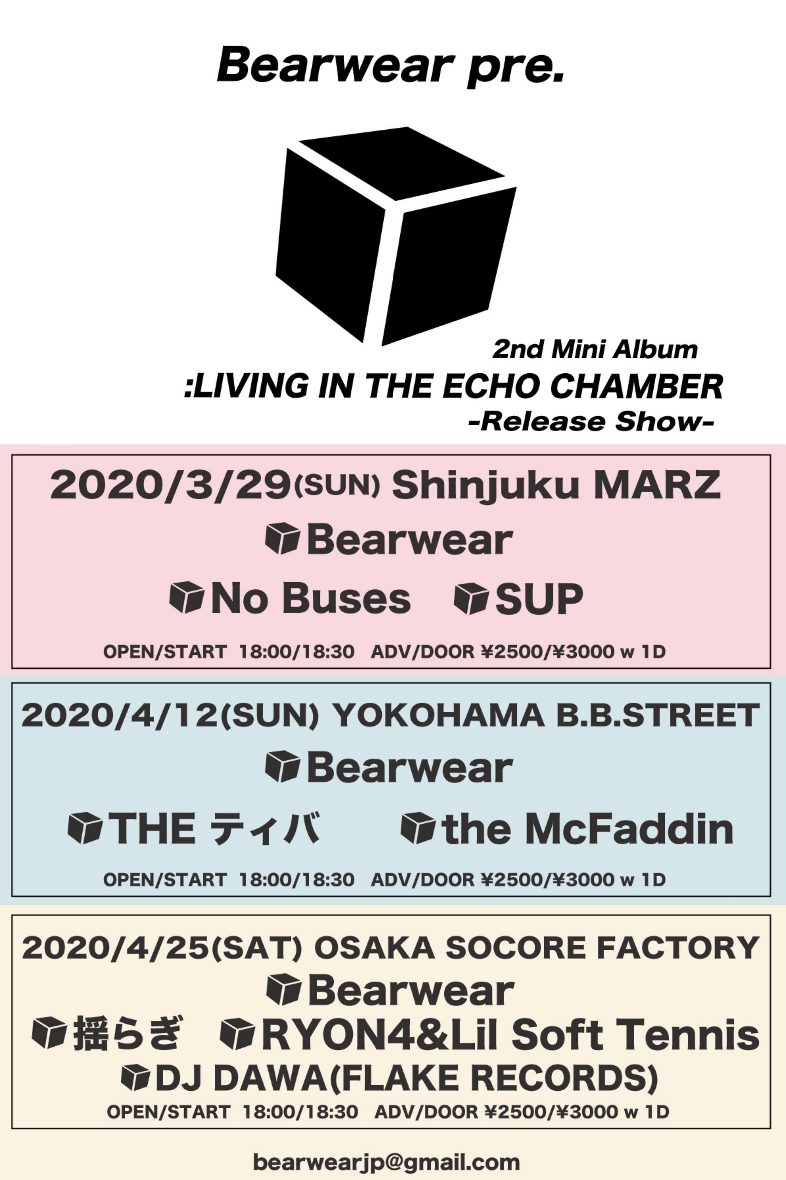 【MV NEWS!!】“Bearwear” 3月29日 (日)発売の2nd Mini Album「:LIVING IN THE ECHO CHAMBER」から、先行配信中の3曲を繋げたShort Film Music Videoを公開。 同時に3月29日のリリースイベント詳細に加えて、4月12日(日) 横浜 BB STREET、4月25日(土)@大阪SOCORE FACTORYにて追加公演の開催決定。