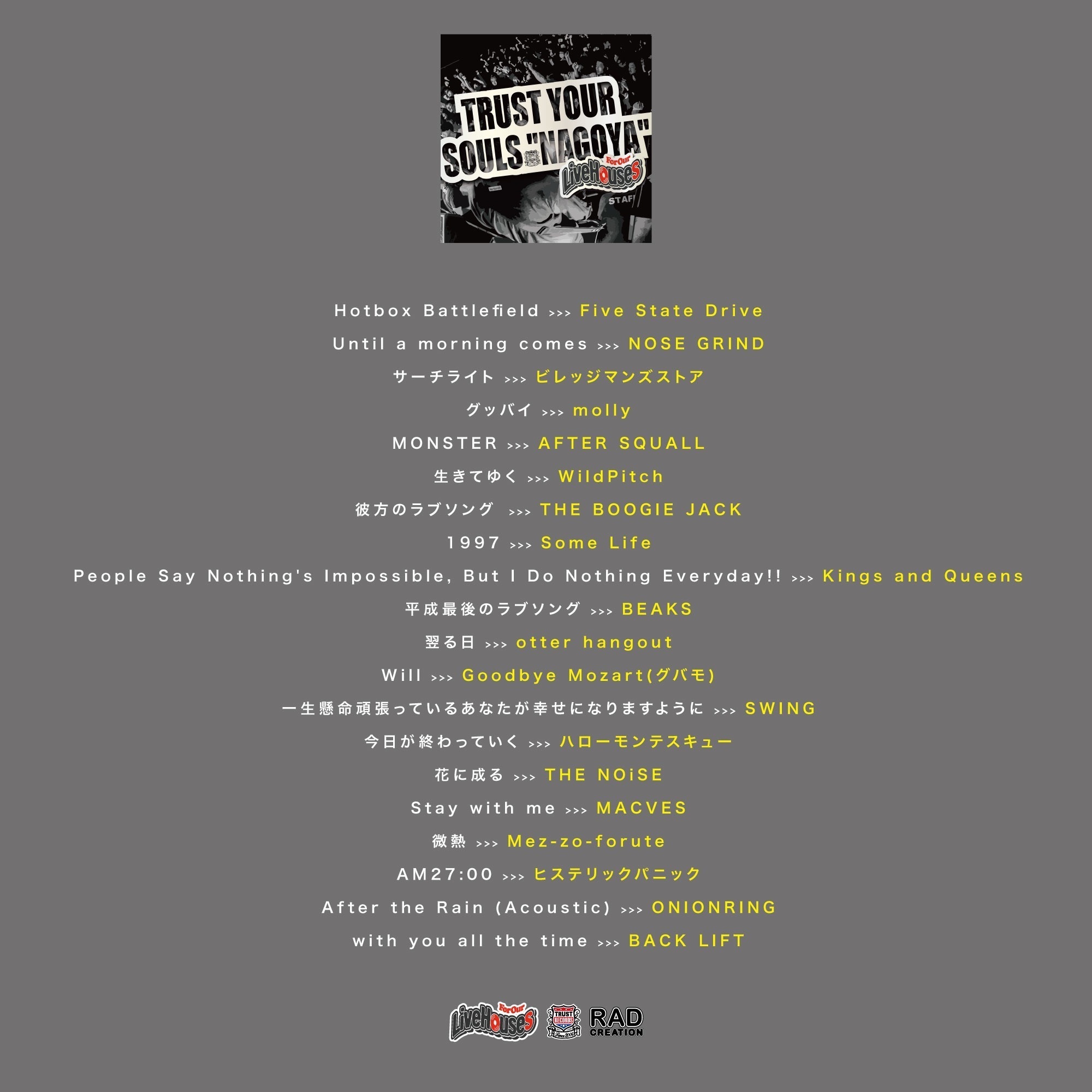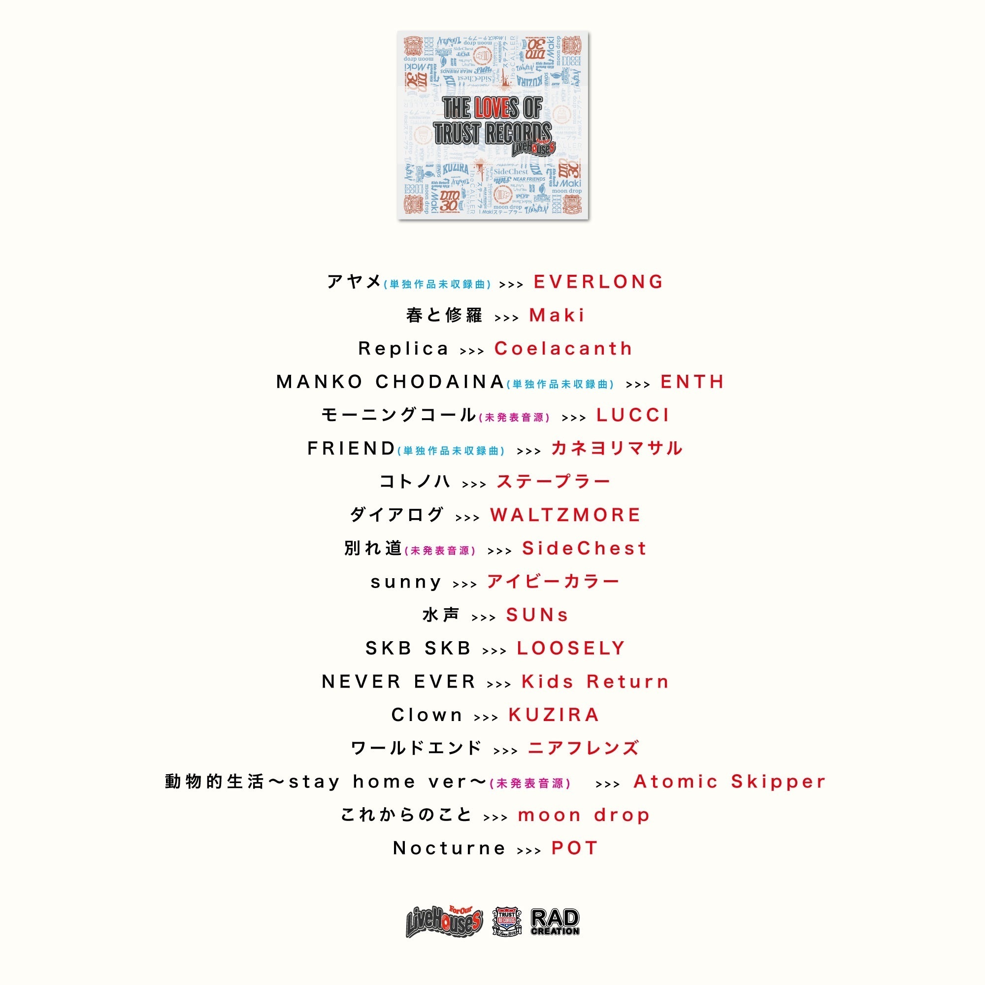 TRUST RECORDSの卒業生であるBACK LIFTを始め、ヒステリックパニック、ビレッジマンズストア、Five State Drive、ONIONRINGなど親交の深いバンド達が賛同し、楽曲を無償提供している。