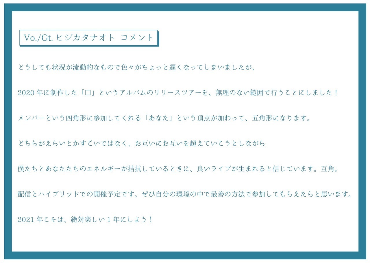 どうしても状況が流動的なもので色々がちょっと遅くなってしまいましたが、2020年に制作した「□」というアルバムのリリースツアーを、無理のない範囲で行うことにしました!