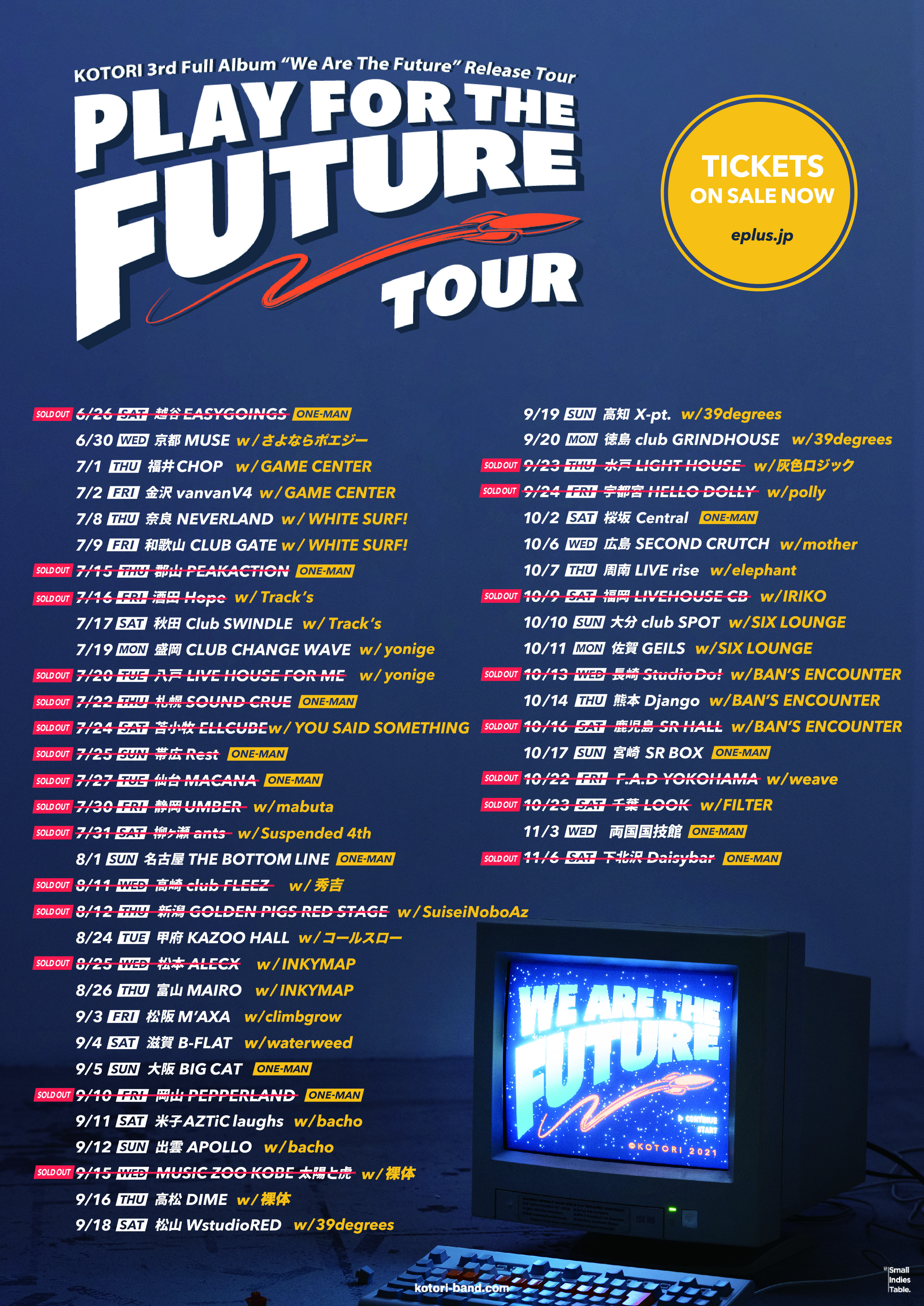 「PLAY FOR THE FUTURE TOUR」は、KOTORIのNew Album「We Are The Future」リリースに伴い開催中のツアー。47都道府県、全50本を回り、セミファイナルは両国国技館でのワンマンライブが決定している。