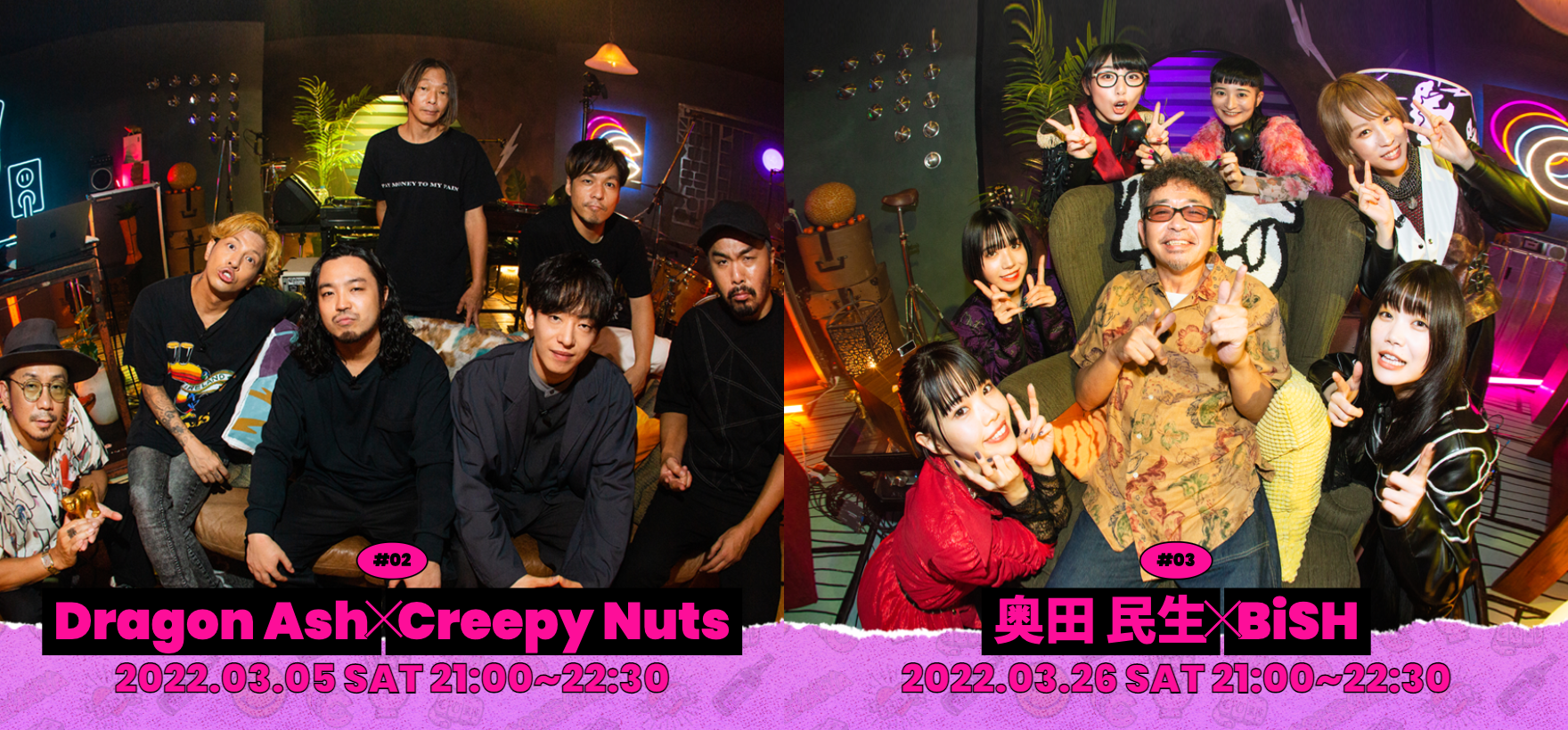 そしてこの度、出演発表だけにとどまっていた#2Dragon Ash × Creepy Nuts(3月5日21:00放送開始)、#3 奥田 ⺠生 × BiSH(3 月26 日 21:00 放送開始)の放送日時、エピソードが公開となり、ともに視聴チケットの販売を開始。