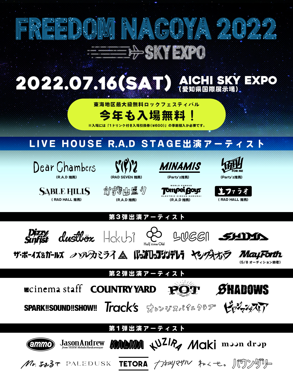 7月16日(土)にAichi Sky Expo(愛知県国際展示場)にて開催されるFREEDOM NAGOYA 2022 -EXPO- Live House R.A.D STAGE出演アーティストとしてDear Chambers(R.A.D推薦) / Made in Me.(RAD SEVEN推薦) / MINAMIS(Party'z推薦) / PRAY FOR ME(Party'z推薦) / SABLE HILLS(RAD HALL推薦) / かずき山盛り(R.A.D推薦) / とんぺいボーイズ(R.A.D推薦) / 生ファラオ(RAD HALL推薦)の8組が発表された。