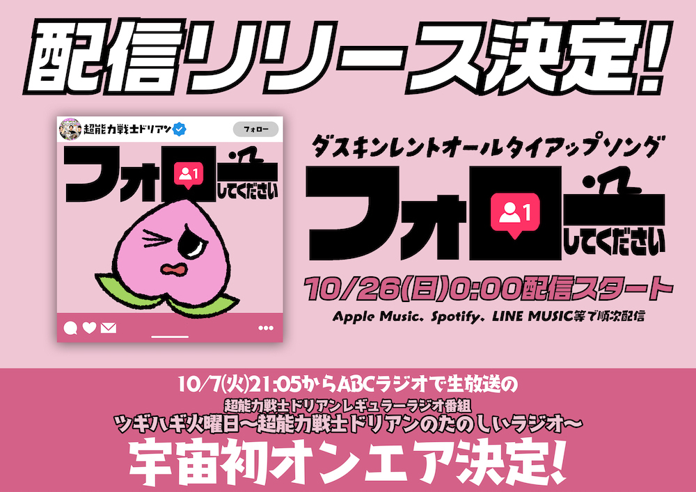 超能力戦士ドリアンが新曲「フォローしてください」を全国ツアー初日(なんばHatch)の10月26日(日)に配信リリースする。