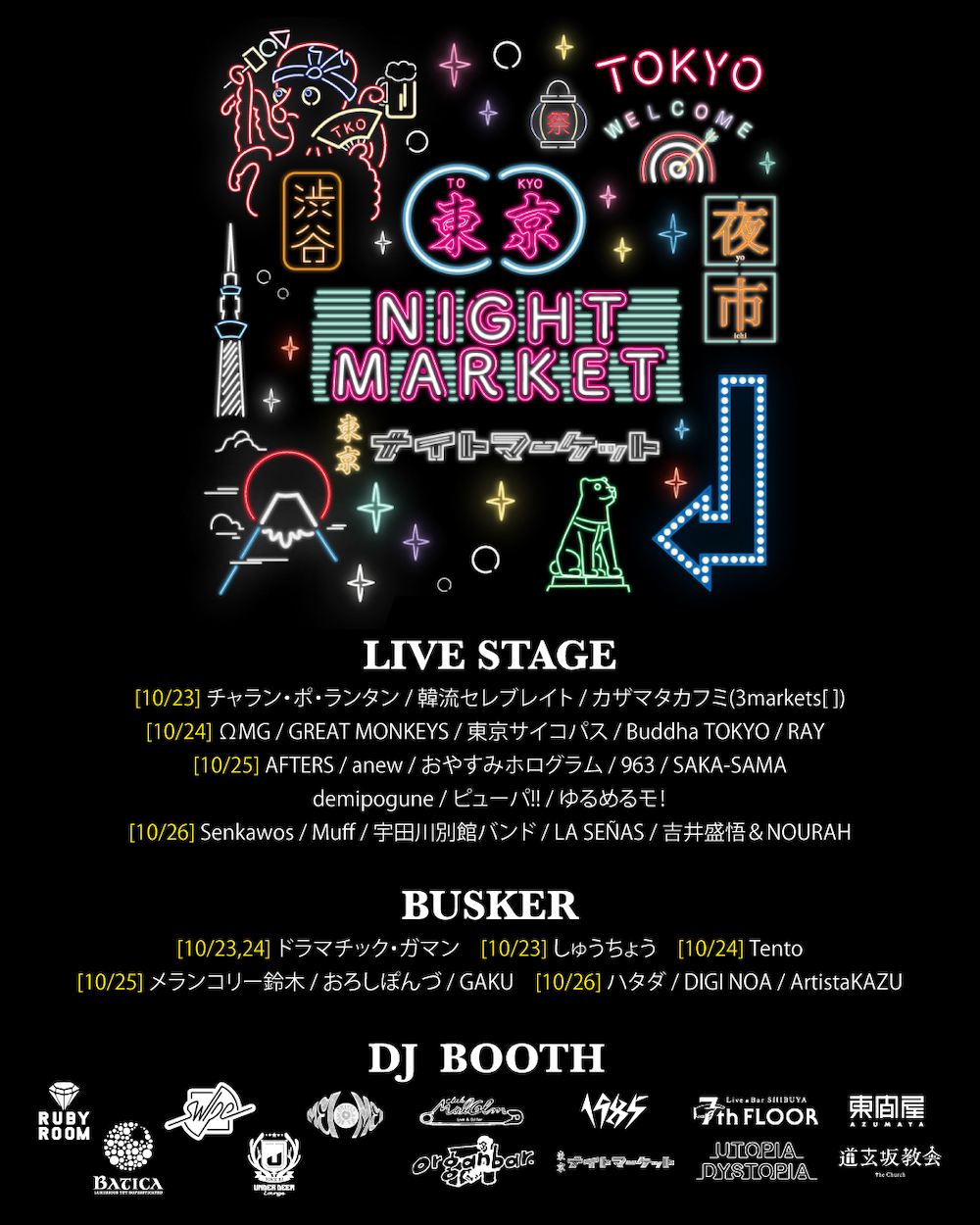過去に5日間で約20万人が来場した本イベントは多様な来場者が集う場として、国内外からの観光客=インバウンド層にも向け、東京ならではのカルチャーを発信。イベントは毎日22時まで開催され、またイベント後にはDJ参加の渋谷クラブ店舗によるアフターパーティを行います。