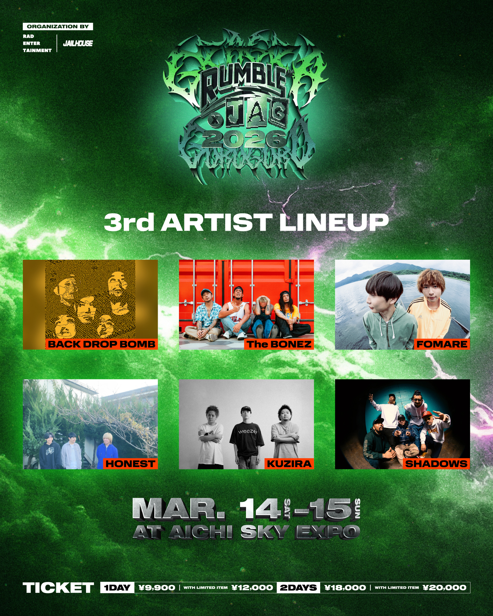 【NEWS!!】RAD ENTERTAINMENT×JAILHOUSEによるパンク・ラウドフェス「RUMBLE×JAG 2026」第3弾アーティストとしてBACK DROP BOMB、The BONEZ、FOMARE、HONEST、KUZIRA、SHADOWSが出演決定!