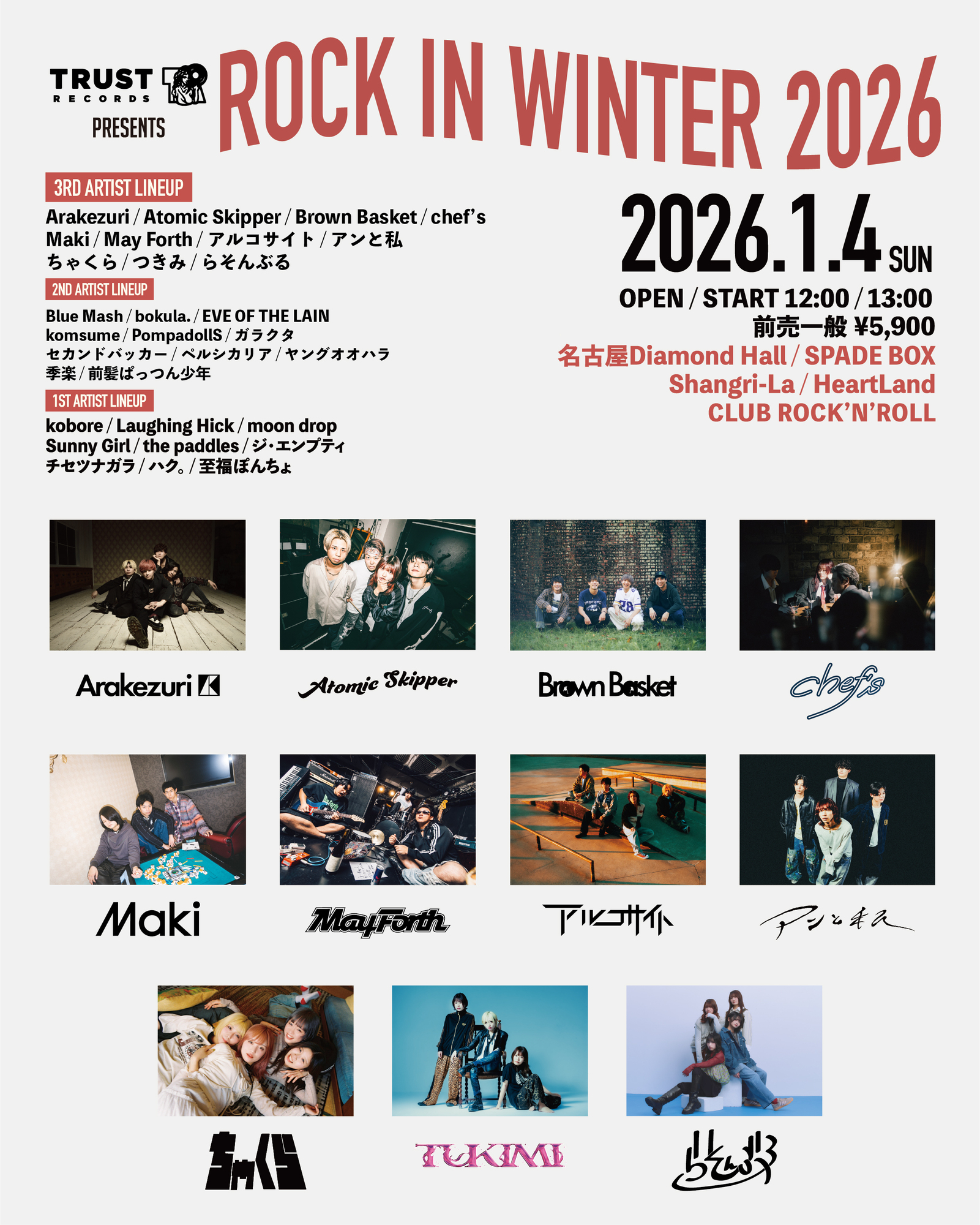 【NEWS!!】名古屋のインディーズレーベル「TRUST RECORDS」が主催する冬のサーキットフェスティバル「ROCK IN WINTER 2026」第3弾出演アーティストとして、Arakezuri / Brown Basket / Maki / May Forth / ちゃくら / つきみ / らそんぶるら豪華ゲスト計11組を発表!